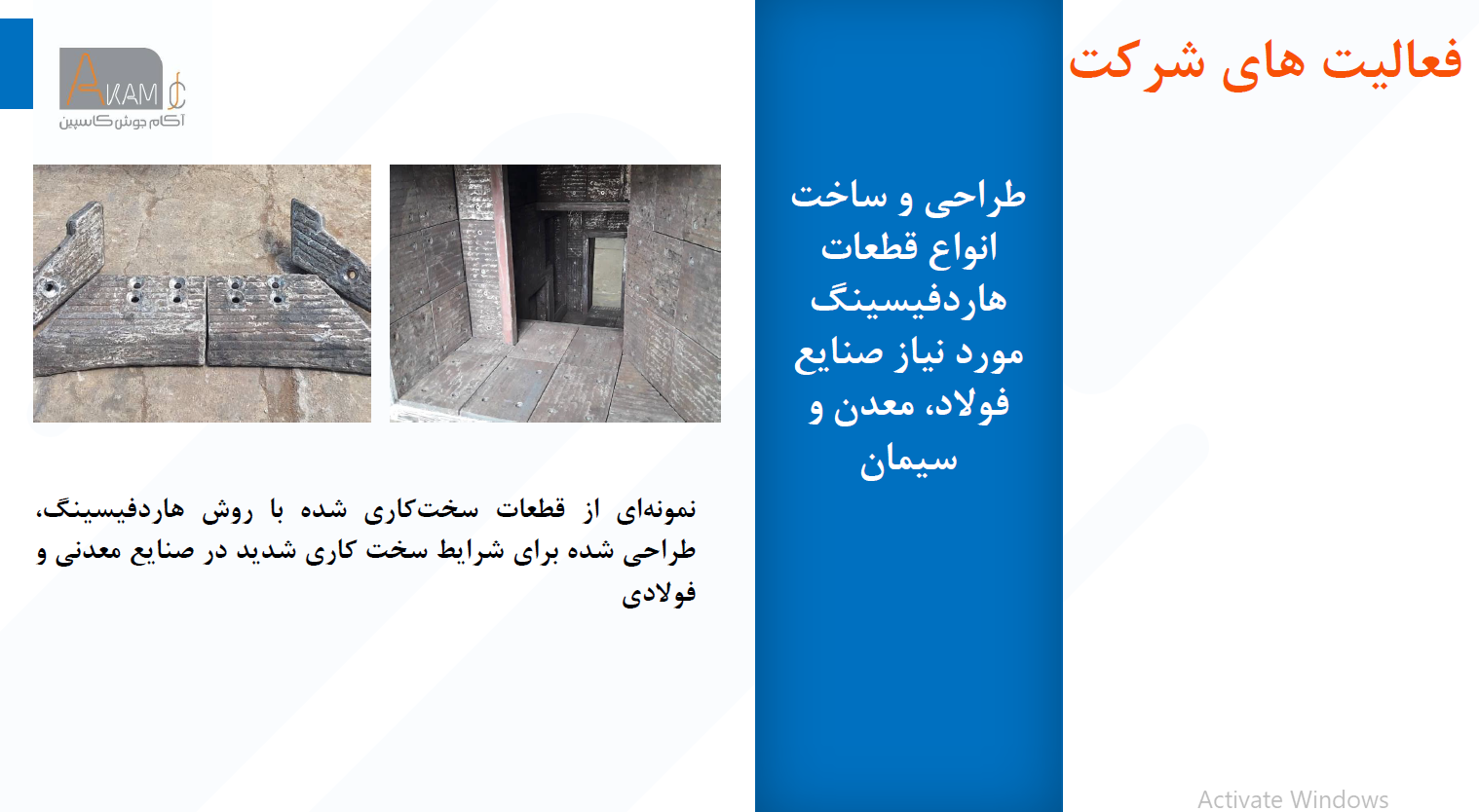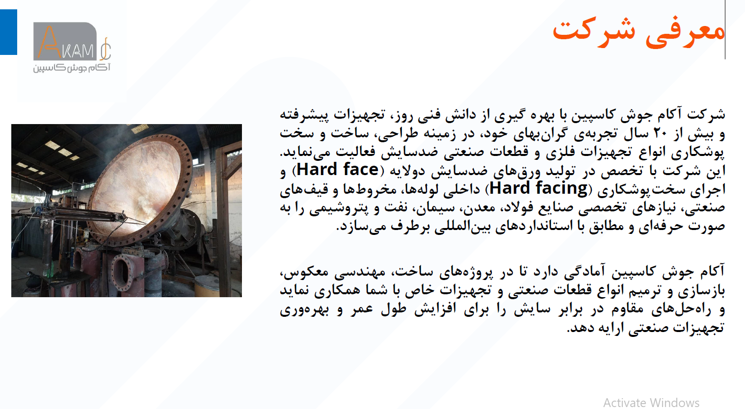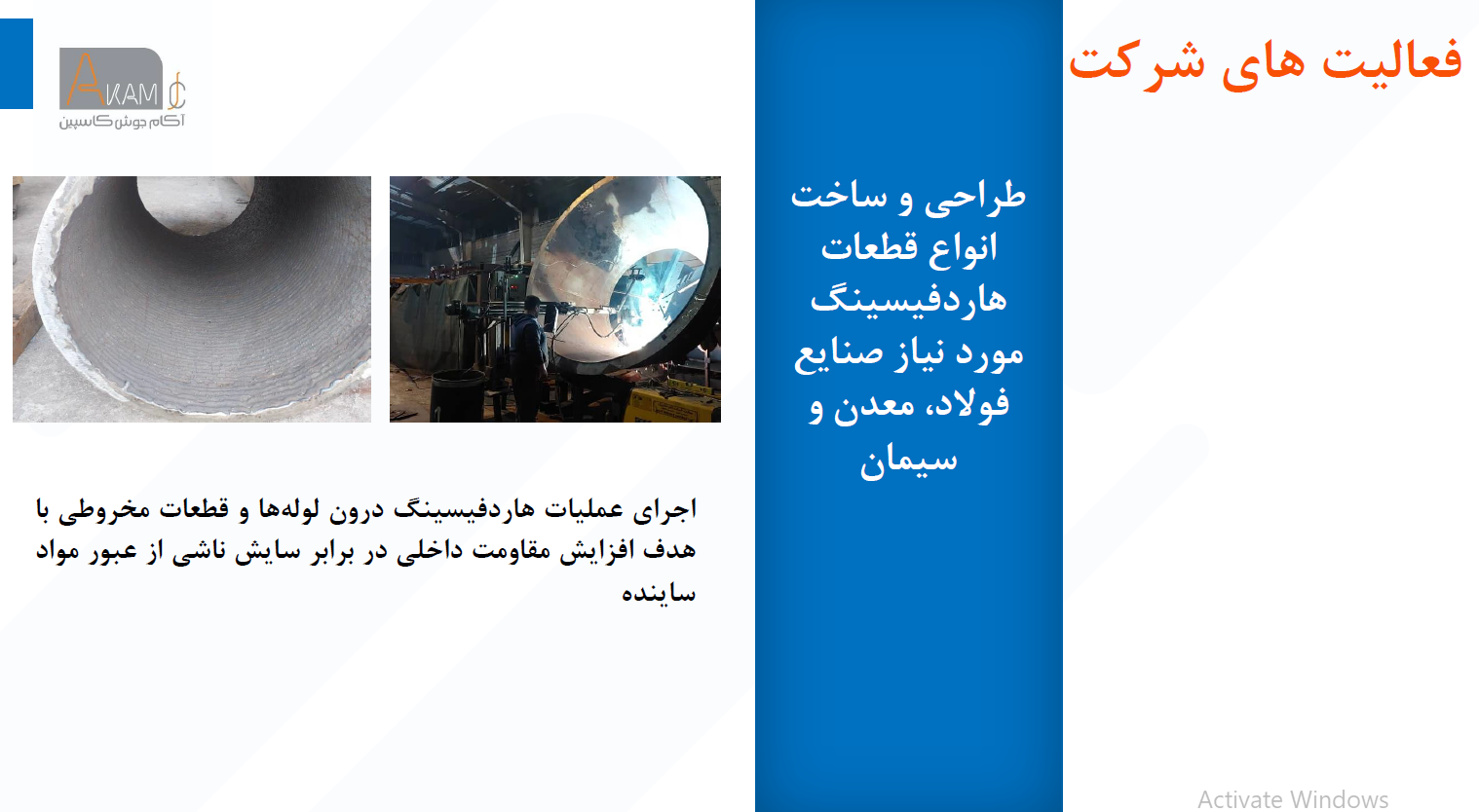 انواع خدمات سخت پوشکاری بر روی قطعات فولادی، تولید ورق های ضد سایش دولایه کروم کارباید ، سخت پوشکاری بر روی انواع غلتک ها ، سخت پوشکاری داخل لوله ها و قیف ها تا قطر 6متر ، ساخت انواع تجهیزات فولادی